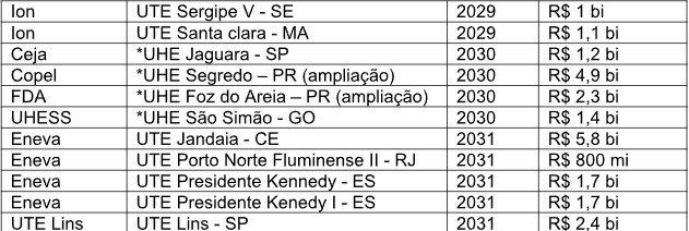 Os projetos de investimentos mais altos são de termelétricas a gás. Só a Eneva vendeu energia para nove projetos a serem construídos que somam mais de R$ 18 bilhões em investimentos.