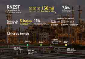 Com o início das obras do segundo trem (unidade) de refino, em dezembro, a Petrobras retomou a ampliação da capacidade da Refinaria Abreu e Lima (RNEST), localizada no Complexo Industrial Portuário de Suape, em Ipojuca (PE). Quando essa fase estiver concluída, em 2029, a refinaria estará produzindo 260 mil barris por dia, dobrando a capacidade atual. Até lá, serão R$ 12 bilhões investidos em obras e serviços complementares.